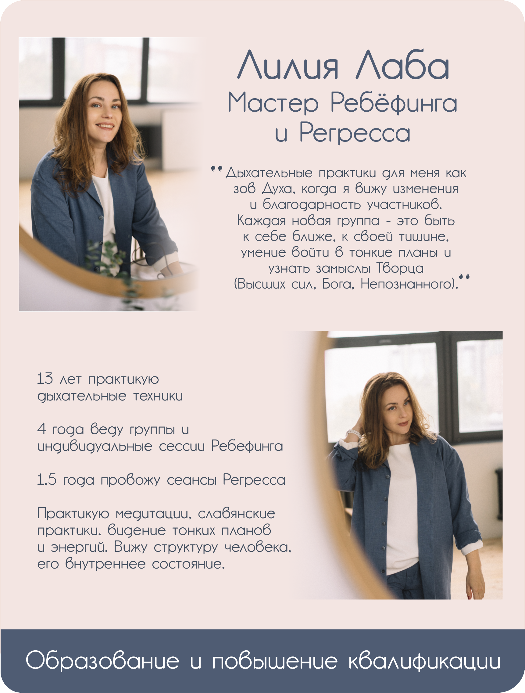 • С 2013 обучаюсь у Ольги Бартеневой (Авторские программы работы с пространством, квантовая психология).